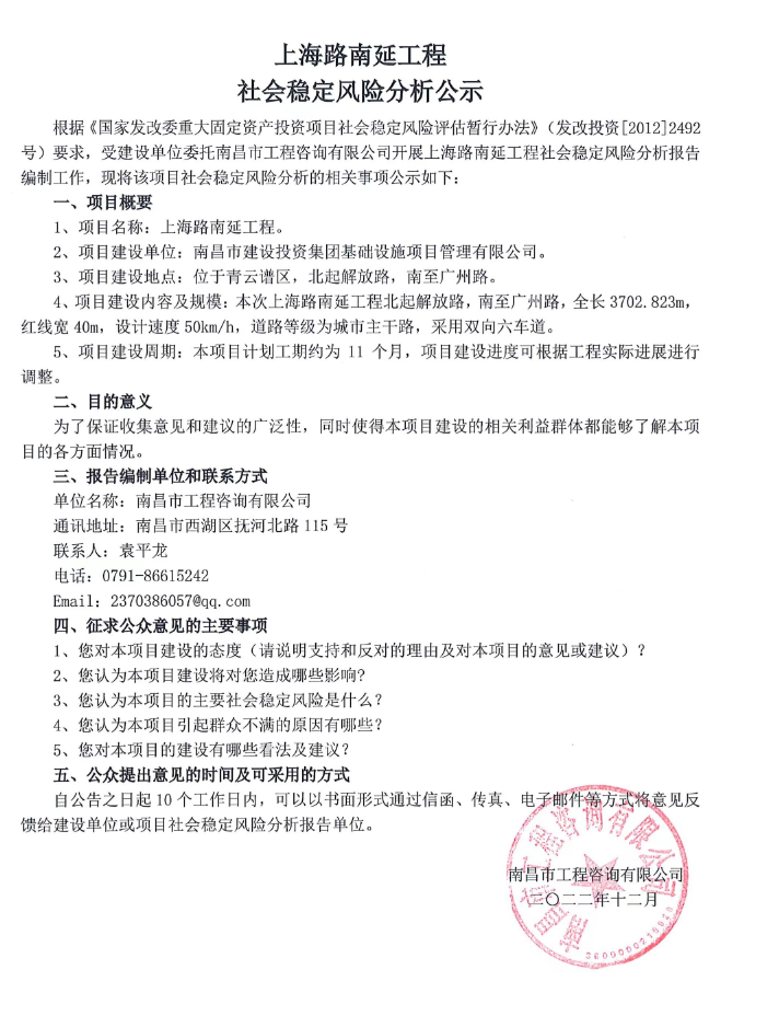 上海路南延工程社會穩(wěn)定風險分析公示